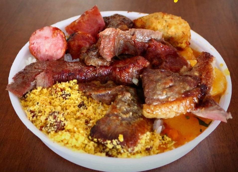 Unidade de Marmita com Arroz Branco, Feijão Tropeiro e Carnes Assadas: Contra Filé, Alcatra,